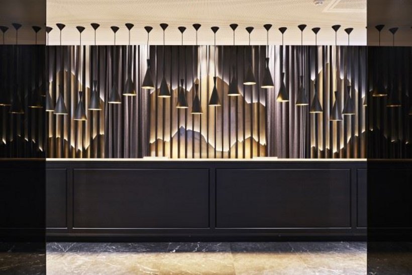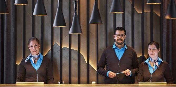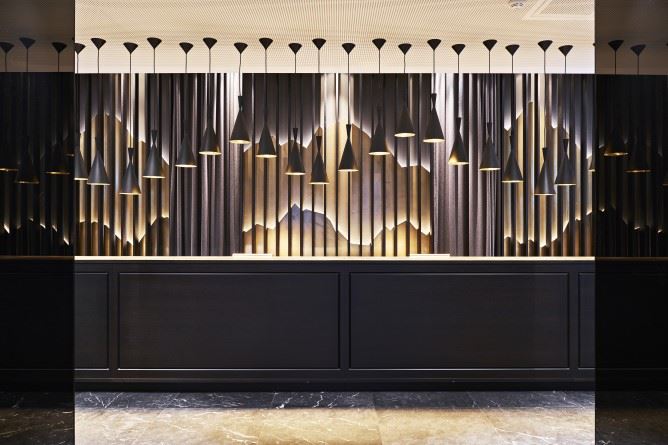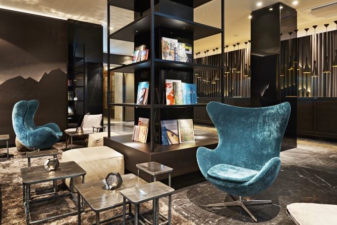 Das lokal inspirierte Design-Thema empfängt den Gast bereits beim Betreten des Hotels. Ebenfalls in Gold erstrahlt das Schweizer Alpenpanorama hinter der Rezeption. Die Silhouetten werden durch hochwertige Lodenvorhänge der Schweizer Firma Christian Fischbacher gerahmt. In verschiedenen Lounge-Ecken stehen edle Ledermöbel des italienischen Luxuslabels Baxter, Filzleuchten von Tom Dixon und goldene Fenster-Vorhänge. Und nicht fehlen darf der für Motel One ikonische Egg Chair in türkis.