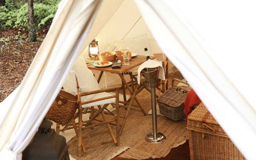 Daraus ist nun die Zusammenarbeit mit dem Vitznauerhof entstanden. So stehen seit dem 1. Juni zwei Zelte im romantischen Retro-Chic im Hotelpark. Die Gäste schlafen zum beruhigenden Plätschern des Bachs in gemütlichen Betten ein und werden morgens von Vogelgezwitscher und sanften Sonnenstrahlen geweckt. [IMG 4]