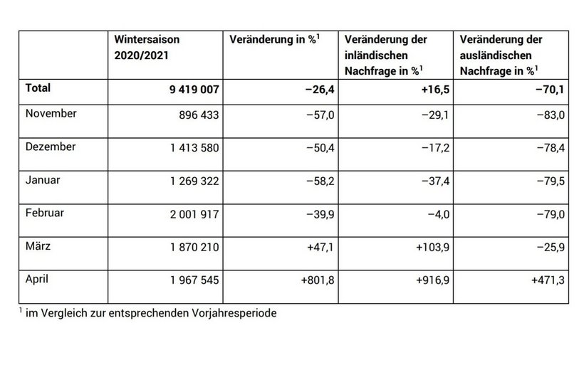 Düster sieht die Bilanz für die touristischen Wintersaison 2020/2021 (von November 2020 bis April 2021) aus. Mit insgesamt 9,4 Millionen Logiernächten gab es einen Rückgang von 26,4 Prozent (–3,4 Millionen Logiernächte) gegenüber der Vorjahresperiode.