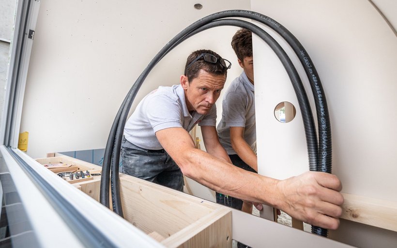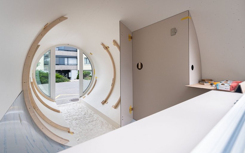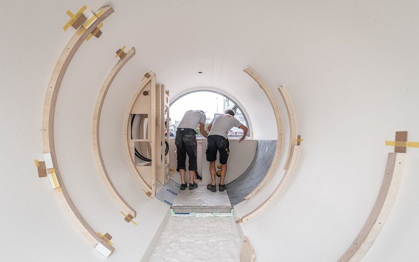 Das elektrifizierte Röhrenzimmer verfügt neben Schlafsofa, Tisch und Einbauschränken über eine durchdachte Badeinrichtung inklusive Lüftung sowie eine Fussbodenheizung. «Ob begehbarer Kleiderschrank oder beheizte Hundehütte – Spezialanfertigungen sind unser Steckenpferd», sagt Schreinermeister Rolf Brändle. «Eine kompakte Zimmerausstattung in einem kreisrunden Raum ist aber durchaus nichts Alltägliches. Die Herausforderung besteht darin, auf kleiner Fläche umfassenden Komfort zu bieten und dabei trotzdem ein grosszügiges Raumgefühl zu erzeugen». Wie die Herausforderung gemeistert wurde, können die Besucherinnen und Besucher der Zuger Messe bestaunen.
