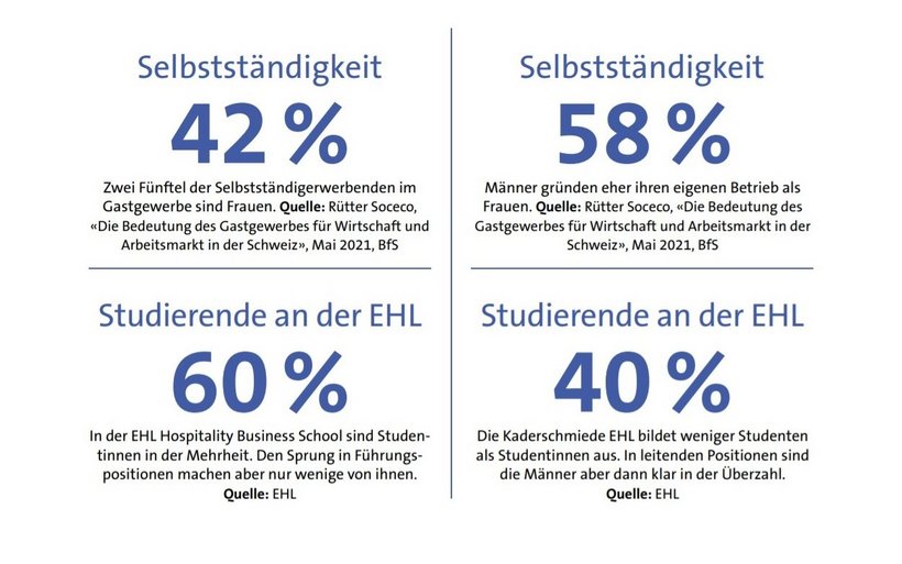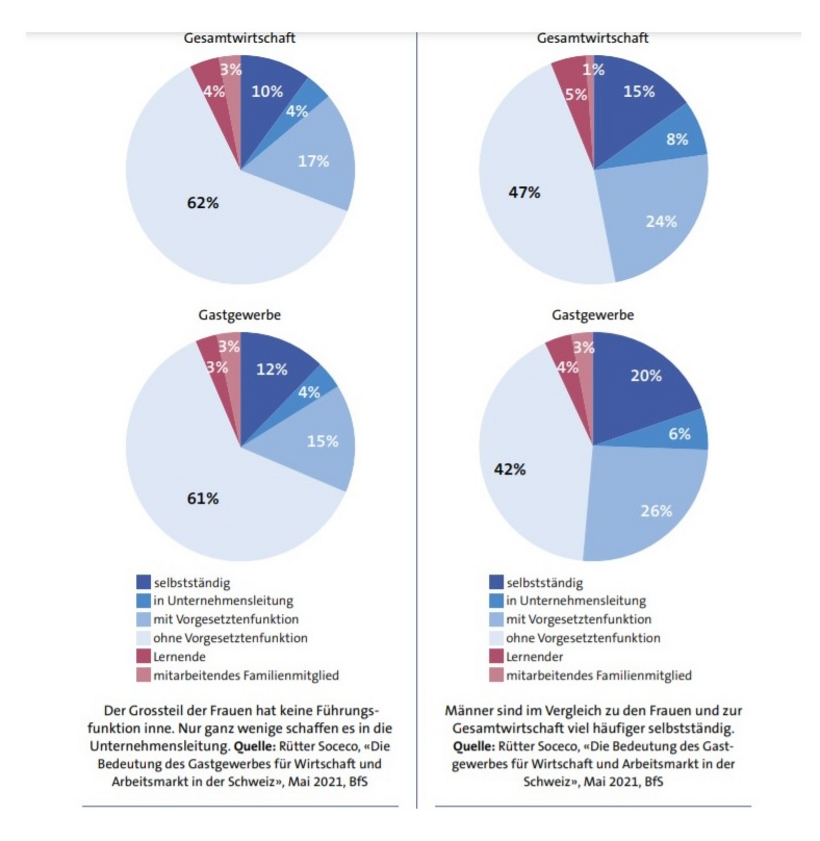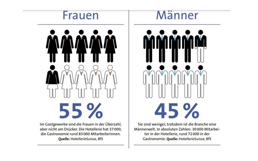 Mehr als die Hälfte der Mitarbeitenden in Hotellerie und Gastronomie sind weiblich. Doch in den Führungsetagen finden sich verhältnismässig wenig Frauen. Jeder vierte Mann im Gastgewerbe hat eine leitende Funktion inne, bei den Frauen ist dies nur knapp jede siebte. Die Branche liegt damit im schweizerischen Durchschnitt: Der prozentuale Anteil an weiblichen Vorgesetzten ist in der Gesamtwirtschaft nur wenig höher. Frauen im Gastgewerbe haben mehrheitlich keine Führungsfunktion inne: gut 60 Prozent. Bei den Männern sind es nur gut 40 Prozent.