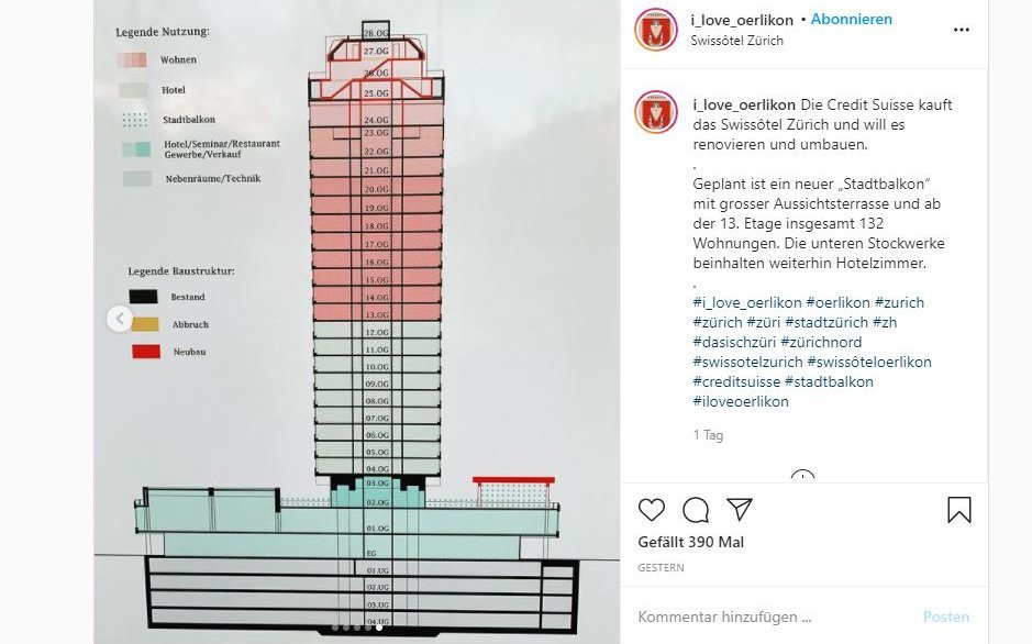 Das 1972 als höchstes Gebäude der Stadt Zürich erbaute «Swissôtel» soll nach der Corona-bedingten Schliessung wieder als Hotelbetrieb eröffnen. Dies jedoch auf verkleinerter Fläche. Eine auf dem Instagram-Profil der Stadt Oerlikon veröffentlichte Planauflage weist darauf hin, dass die Credit Suisse (CS) eine Sanierung und Revitalisierung des Gebäudes vornehmen will.