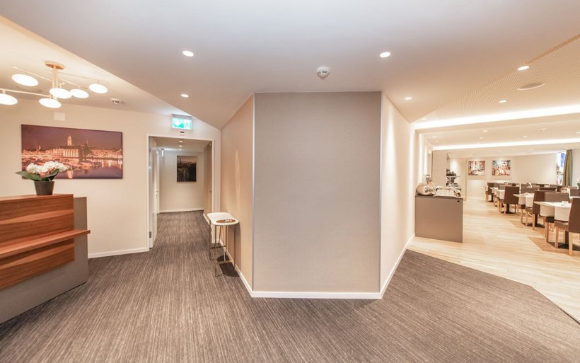 Der Empfangsbereich mit der Rezeption sowie die Lounge mit dem Frühstücksraum, der den Gästen auch tagsüber offensteht, wurden komplett neu gestaltet und eingerichtet. Gleichzeitig wurden die offenen, einladenden Räume mit einem neuen Lichtkonzept versehen.