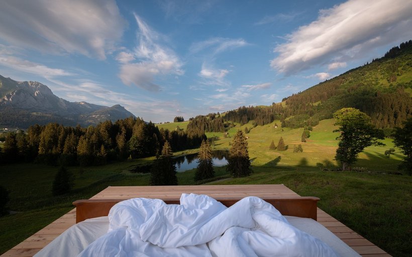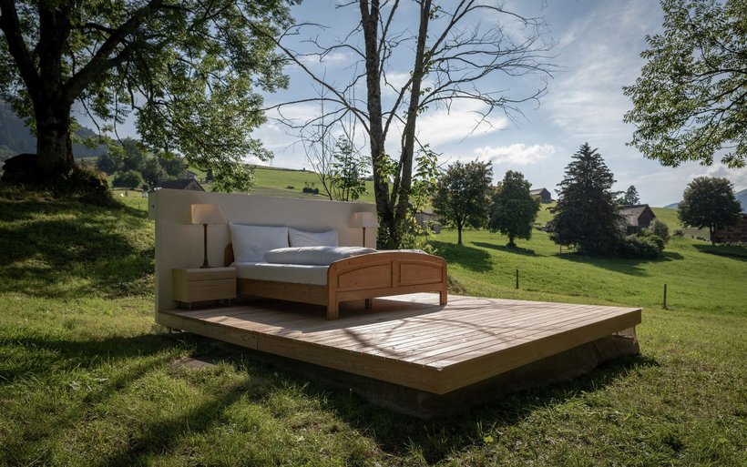 Während der Sommersaison können an drei Standorten im Toggenburg Openair-Hotelbetten gebucht werden. Offeriert werden sie unter den Bezeichnungen «immobilienbefreite Hotelzimmer» oder «Zero Real Estate».