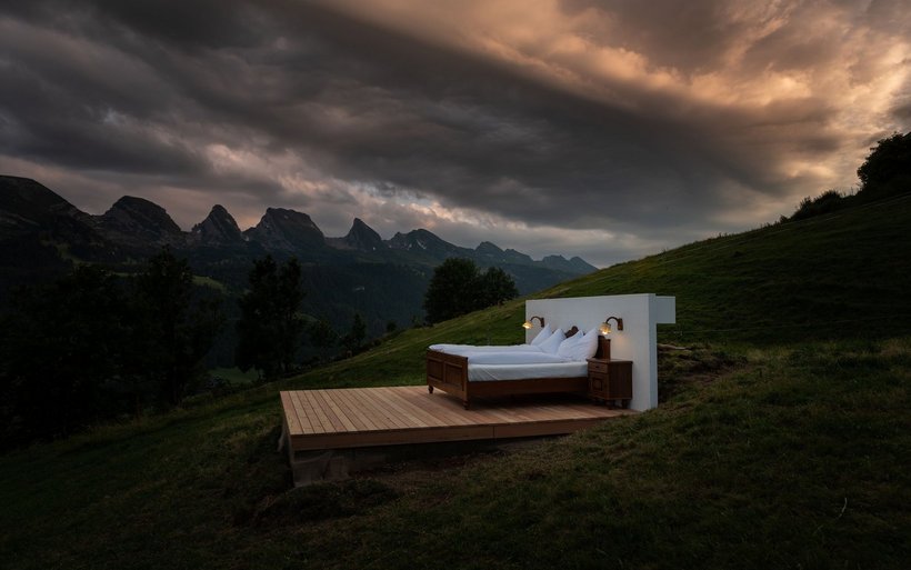 Was inzwischen wie ein schweizweiter Tourismus-Trend aussieht, hat in der Ostschweiz eine andere Geschichte: Die umtriebigen St. Galler Konzeptkünstler Frank und Patrik Riklin lancierten 2016 zuerst im Safiental und 2017 im Appenzellerland eine Variante ihres «Null Stern Hotels». Bereits mit Betten in Luftschutzbunkern schafften sie es in die internationalen Medien. Nun war es ein Hotelbett unter freiem Himmel samt Butler in Gummistiefeln und Sicht auf den Alpstein. Beworben wurde das Angebot mit ähnlich ikonischen Fotos, wie sie nun auf der Seite von Toggenburg Tourismus zu sehen sind. Die Nachfrage nach einem Openair-Hotelbett war so gross, dass am Schluss der Saison eine Warteliste mit über 4000 Namen übrig blieb.