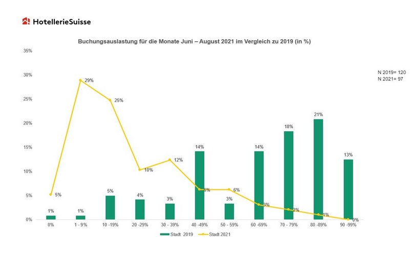 Zum Vergleich: In den Monate Juni bis August in den Jahren 2017 bis 2019 wiesen die alpinen Regionen eine durchschnittliche Auslastung von 51 Prozent aus. Noch dramatischer ist das Bild in der Stadthotellerie. 59 Prozent der befragten Betriebe rechnen mit weniger als 20 Prozent Zimmerauslastung. Dieser Wert lag in den Vergleichsmonaten 2017 bis 2019 bei durchschnittlich 73 Prozent.