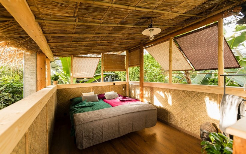 Die Kurzferien in den Tropen, inmitten des Berner Oberlandes, werden in einem eigenen Häuschen, im Thai-Stil, verbracht. Während das Erdgeschoss mit einem kleinen Sitzplatz und Hängematte zum Verweilen einlädt, schläft es sich im ersten Stock im offenen Holzambiente wunderbar. Ausgestattet ist das tropische Idyll mit einem grosszügigen Bett, Ventilator, Jalousien und einer Regendusche. [IMG 5]