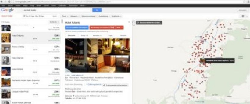 Roland Schegg und Michael Fux vom Institut für Tourismus (ITO) der Fachhochschule HES-SO Wallis in Sierre haben jetzt untersucht, wie der «Hotelfinder» in der Walliser Hotellerie als Marketing- und Vertriebskanal bereits genutzt wird, und wie es um die Qualität der Hotelpräsenzen auf dem Google Hotelfinder bestellt ist. Es wurde dabei analysiert, wie vollständig die Informationen zu den Hotels (Infrastruktur, Beschreibung, Fotos, Beschreibung der Zimmer) und auf welchen Kanälen und zu welchem Preis diese für ein bestimmtes Datum verfügbar sind.