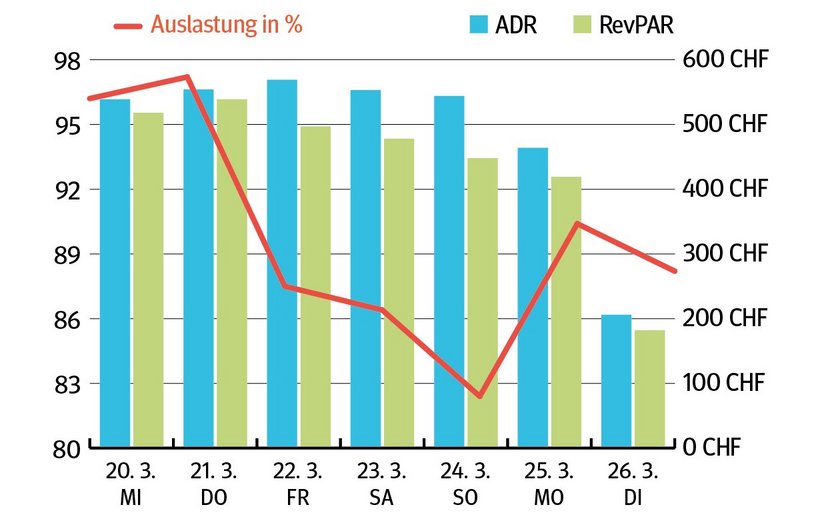 Während der diesjährigen Baselworld erzielten die Stadtbasler Hotels gemäss Marktforschung von STR durchschnittlich eine Auslastung von 90 Prozent und einen Netto-Preis pro Zimmer von 490 Franken (siehe Grafik). Im Vergleich zu den letzten Jahren fiel 2019 der durchschnittliche RevPAR der sieben Messenächte mit 440 Franken jedoch deutlich geringer aus. «Die Hotels sind während der Baselworld bei der Preisgestaltung vorsichtiger geworden», konstatiert Christian Strieder, Country Manager DACH-Raum bei STR. Die durchschnittlich erwirtschaftete Netto-Zimmerrate lag gut 78 Franken unter dem Vorjahr.