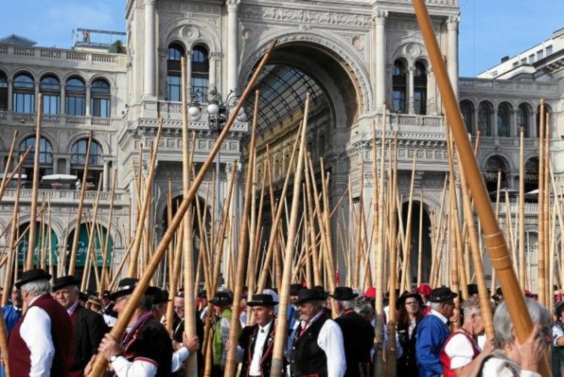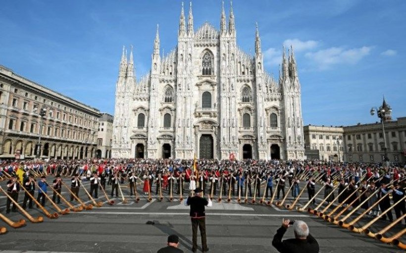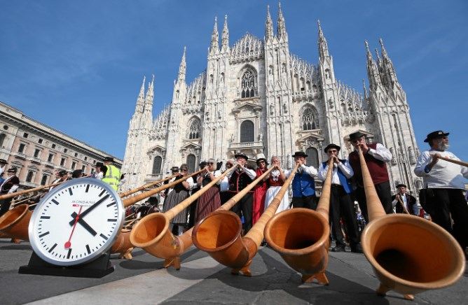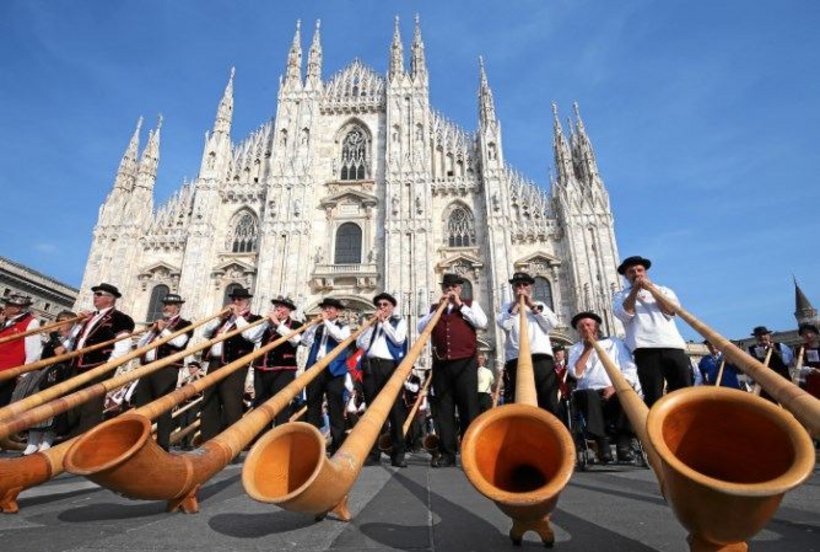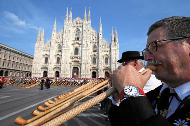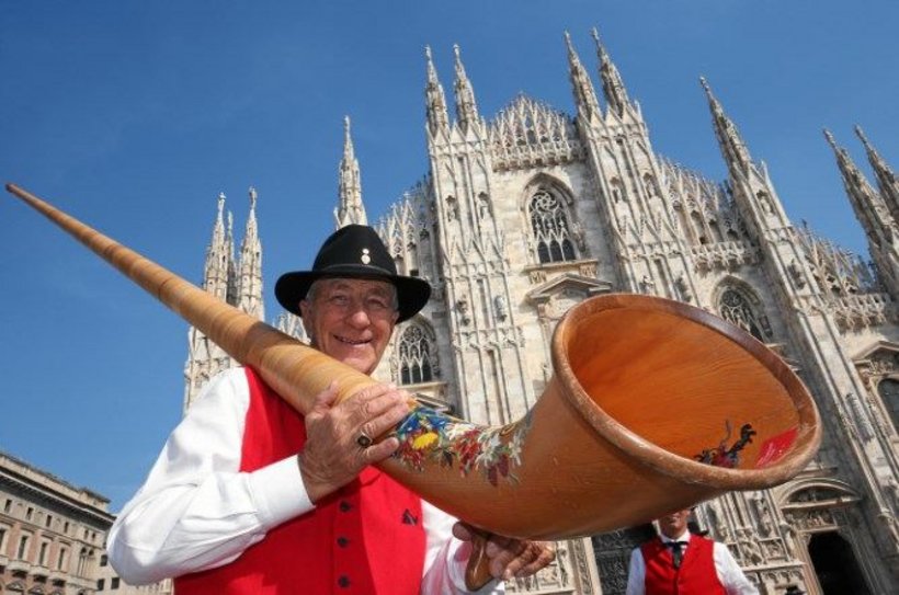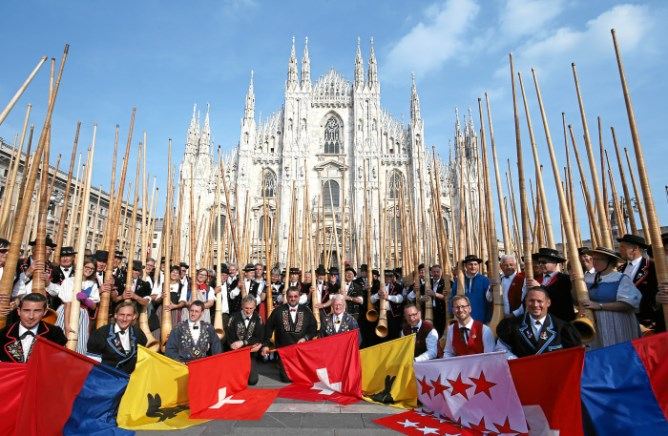 Nach dem Postautoton brachten die Alphornbläser die Stücke «San Gottardo» und «Marignano» zur Aufführung. Am Auftritt vor dem Mailänder Dom hielten Bundesrat Ueli Maurer und der Mailänder Bürgermeister Reden.