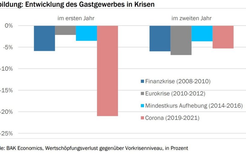 Derzeit herrscht ein nahezu vollständiger Stopp in der Hotellerie, auch in der Gastronomie ist die Situation nur graduell besser. Gemäss einer aktueller Schätzung von BAK Economics droht dem Schweizer Gastgewerbe ein zehnmal stärkerer Einbruch als der Gesamtwirtschaft: Mehr als ein Fünftel der Wertschöpfung wird im Jahr 2020 wegbrechen (Gesamtwirtschaft -2,5 Prozent). Das Gastgewerbe sei damit die am schwersten von der Corona-Krise betroffene Branche der Schweiz, wie das Wirtschaftsforschungsinstitut in einer Mitteilung vom Donnerstag festhält.