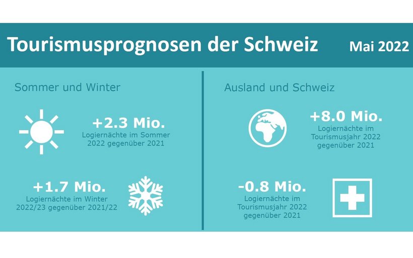 Die Tourismusprognosen, die BAK Economics im Auftrag des Staatssekretariats für Wirtschaft (Seco) erstellt, gehen für die kommende Sommersaison von einer steigenden Nachfrage nach Logiernächten in der Schweiz aus. Das Forschungsbüro erwartet ein Plus von 2,3 Millionen Übernachtungen gegenüber Sommer 2021. Dies, obschon die Folgen des Angriffskriegs in der Ukraine die Erholung von der Covid-19-Krise abbremsen.