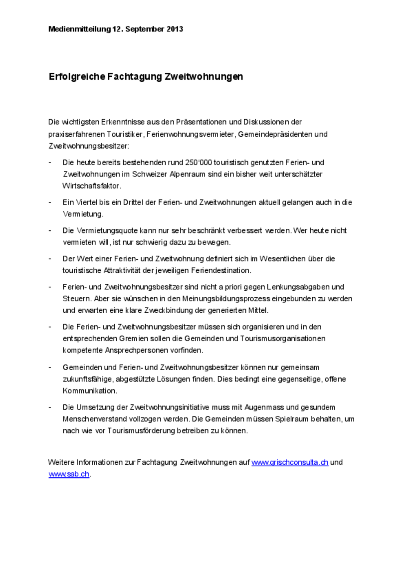 Noch sind nicht alle Fragen geklärt, es tauchen gar neue auf. «Lösungen statt Fragen» war dann auch das Motto der Fachtagung Zweitwohnungen vom vergangenen Dienstag in Zürich, organisiert von der Churer Beratungsunternehmung grischconsulta und der Schweizerischen Arbeitsgemeinschaft für die Berggebiete (SAB).