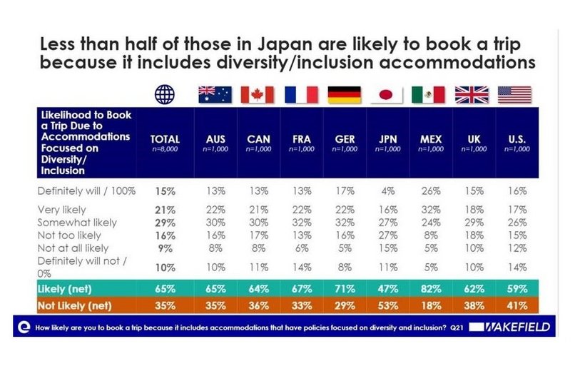 Buchungsentscheidungen, die auf integrativen Richtlinien und Praktiken basieren, sind laut Expedia ein globaler Trend. Die Befragten in allen untersuchten Märkten, einschliesslich Australien, Kanada, Frankreich, Deutschland, Japan, Mexiko, Grossbritannien und den Vereinigten Staaten, wollten demnach auf inklusive Richtlinien achten, bevor sie auf den Bestätigungsknopf drückten. Spitzenreiter sind Mexiko und Deutschland, wo 82 bzw. 71 Prozent der Befragten angaben, Unterkünfte mit Richtlinien für Inklusion und Diversität (I&D) auszuwählen. Keinen grossen Unterschied gibt es in dieser Hinsicht zwischen den Geschlechtern (62 Prozent der Männer gegenüber 67 Prozent der Frauen).