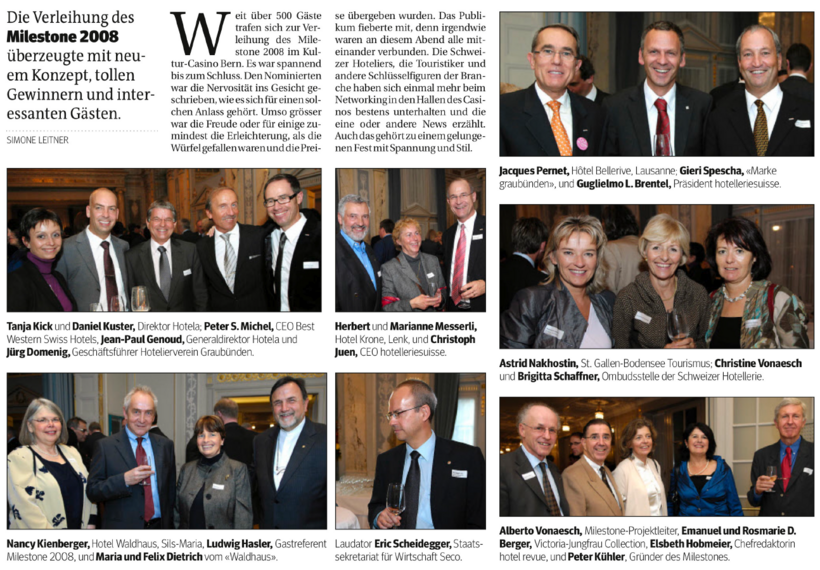 Erstmals in der Geschichte des Tourismuspreises Milestone waren im Jahr 2008 die Gewinner nicht bereits vor der Preisverleihung bekannt. So blieb beim Publikum und den Nominierten die Spannung bis Moderator Nik Hartmann die Sieger auf die Bühne holte. Auch der Austragungsort war neu: Die Preisverleihung fand zum ersten Mal im Kultur-Casino Bern statt, wo über 500 Schweizer Hoteliers, Touristiker und Schlüsselfiguren der Branche bis zuletzt mitfieberten.