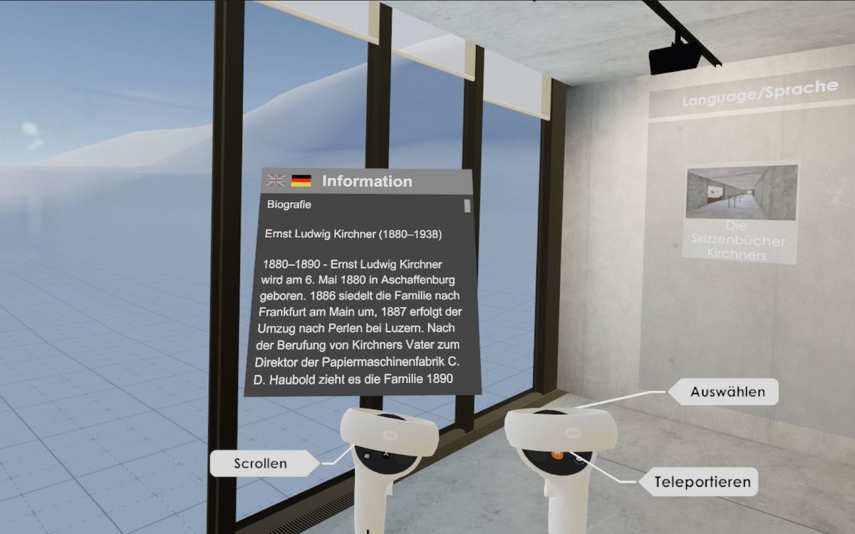 Das Kirchner Museum Davos hat seine gesamte Ausstellung digital erfasst und daraus eine 3D-Welt geschaffen. Den Gästen ermögliche dies ein «immersives Erlebnis und ein vollständiges Eintauchen in die Ausstellung», wie das Museum mitteilte. Mit einer geeigneten Virtual-Reality-Brille soll man bequem vom Sofa aus die Bild- und Farbenwelt Ernst Ludwig Kirchners bestaunen können. Die Ausstellung könne bald über den frei zugänglichen «Occulus Store» heruntergeladen werden, versprechen die Macher. [IMG 2]