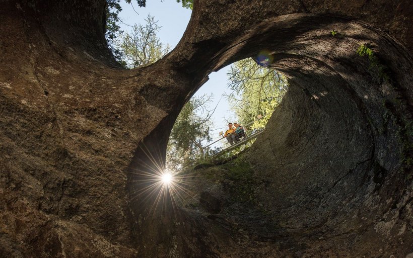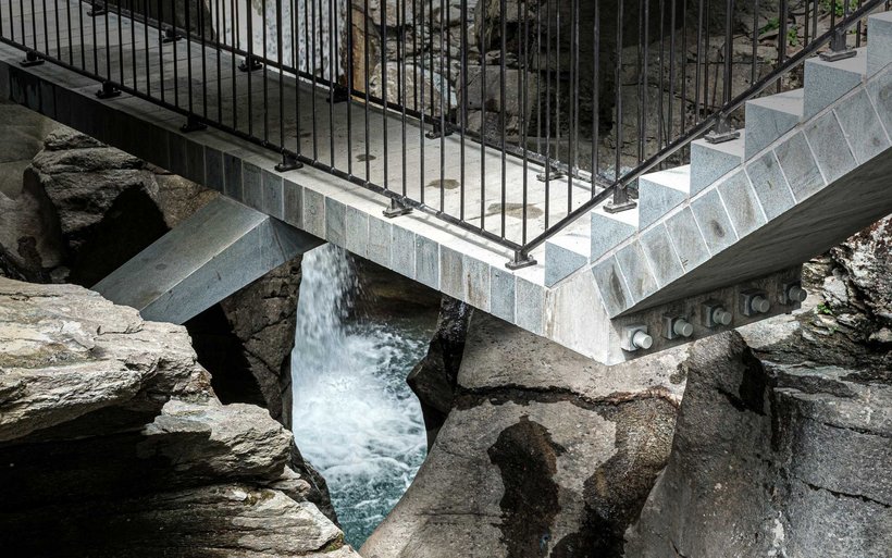 Nun sind auch diese Stellen durch den kunstvoll zusammengefügten Granitsteg erschlossen, wie der Verein Gletschergarten Cavaglia mitteilte. Über eine Brücke, Treppenstufen und Stege geht es durch und in die Schlucht.[IMG 2-5]