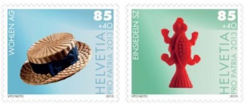 Die vier Sondermarken zeigen einen Strohhut aus Wohlen AG, eine Votivkröte aus Einsiedeln (SZ, je 85 Rappen) sowie einen Zimmererhobel aus Bagnes (VS) und eine geschnitzte zweifarbige Holzkuh aus Lichtensteig (SG, je 1 Franken).