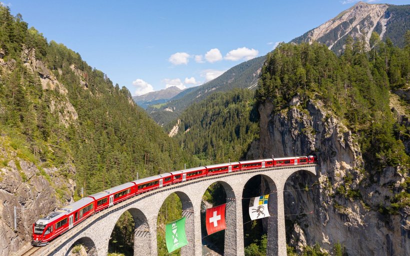 [IMG 2]Der Höhepunkt der Fahrt: die überdimensionalen Kantonsflaggen der beiden Ostschweizer Kantone am «Wahrzeichen Graubündens», dem Landwasserviadukt. «Für 30 Tage wehen die beiden Fahnen nun zwischen den markanten Bögen unseres meistfotografierten Markenzeichens. Mit dieser Augenweide heissen wir die St. Galler Gäste ganz besonders willkommen», so Renato Fasciati, Initiant des Projektes und Direktor der Rhätischen Bahn.